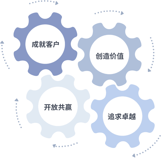 成就客户是一切决策的出发点,,,,创造价值是衡量所有工作的标准,,追求卓越是我们做事做人的态度,,,开放共赢是我们的格局也是最终的结果。。。价值观的齿轮环环相扣,,,推动着组织里的每个人不断向前。。
